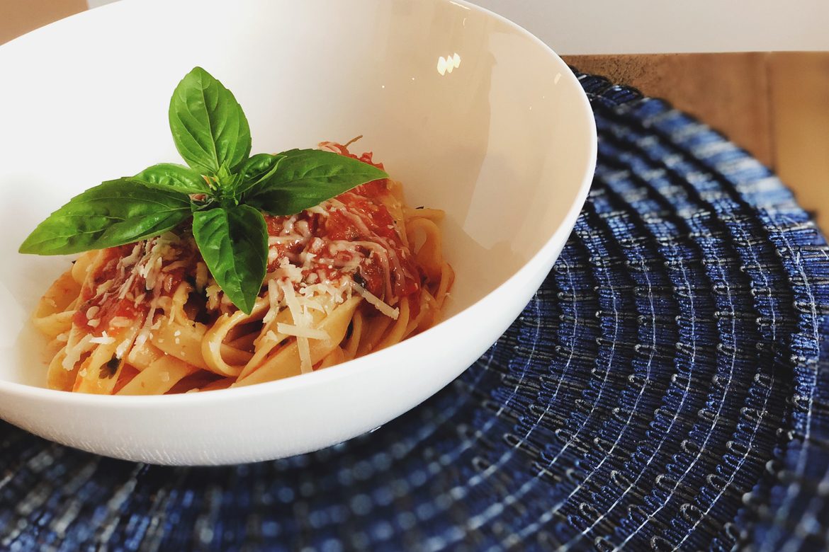 9. This time, I boiled fettuccine pasta, added some parmesan cheese and threw a sprig of fresh basil to top it off!